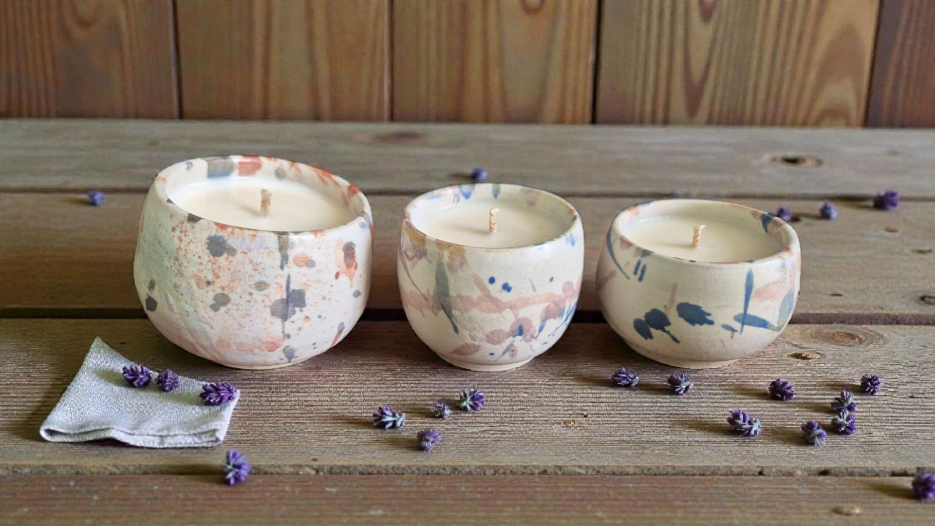 Trilogie de bougies en grès blanc moucheté, aux formes douces et aux éclats picturaux pastel
