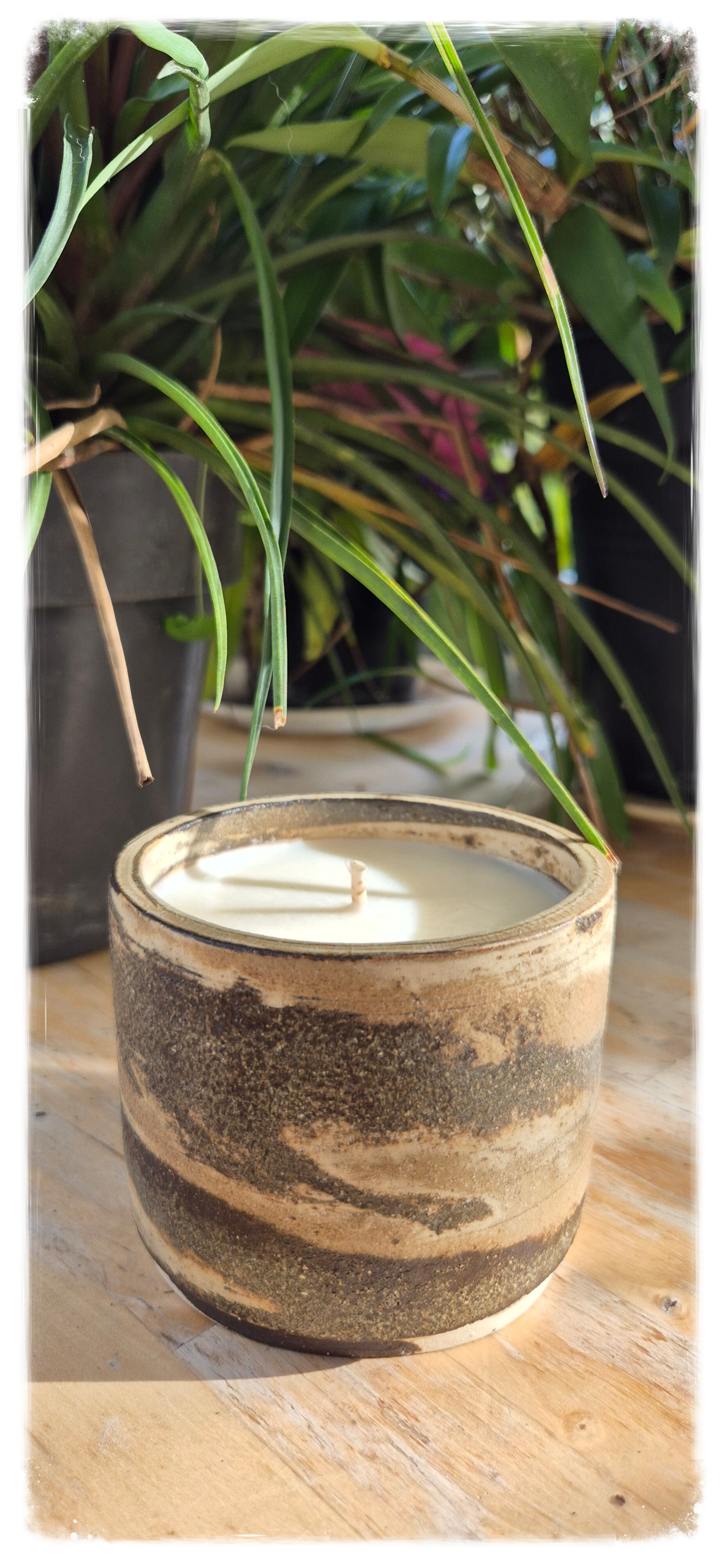 - Contenant : pot en céramique artisanal, terres mêlées (tons crème, brun et sable)