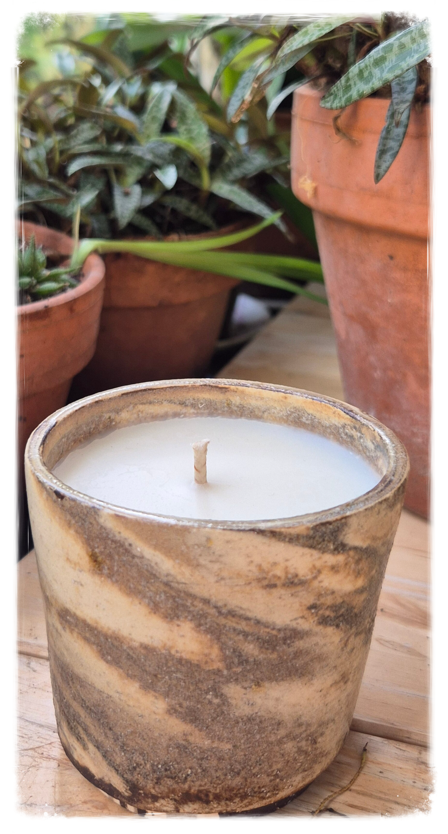- Contenant : pot en céramique artisanal, terres mêlées (tons crème, brun et sable)