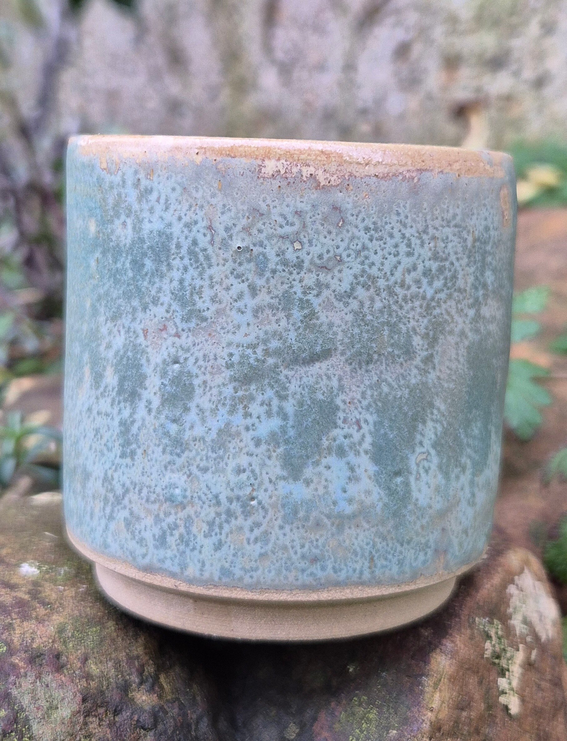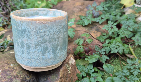 - Contenant : pot en céramique artisanal en grès moucheté vert clair aux reflets de vieux jaune.